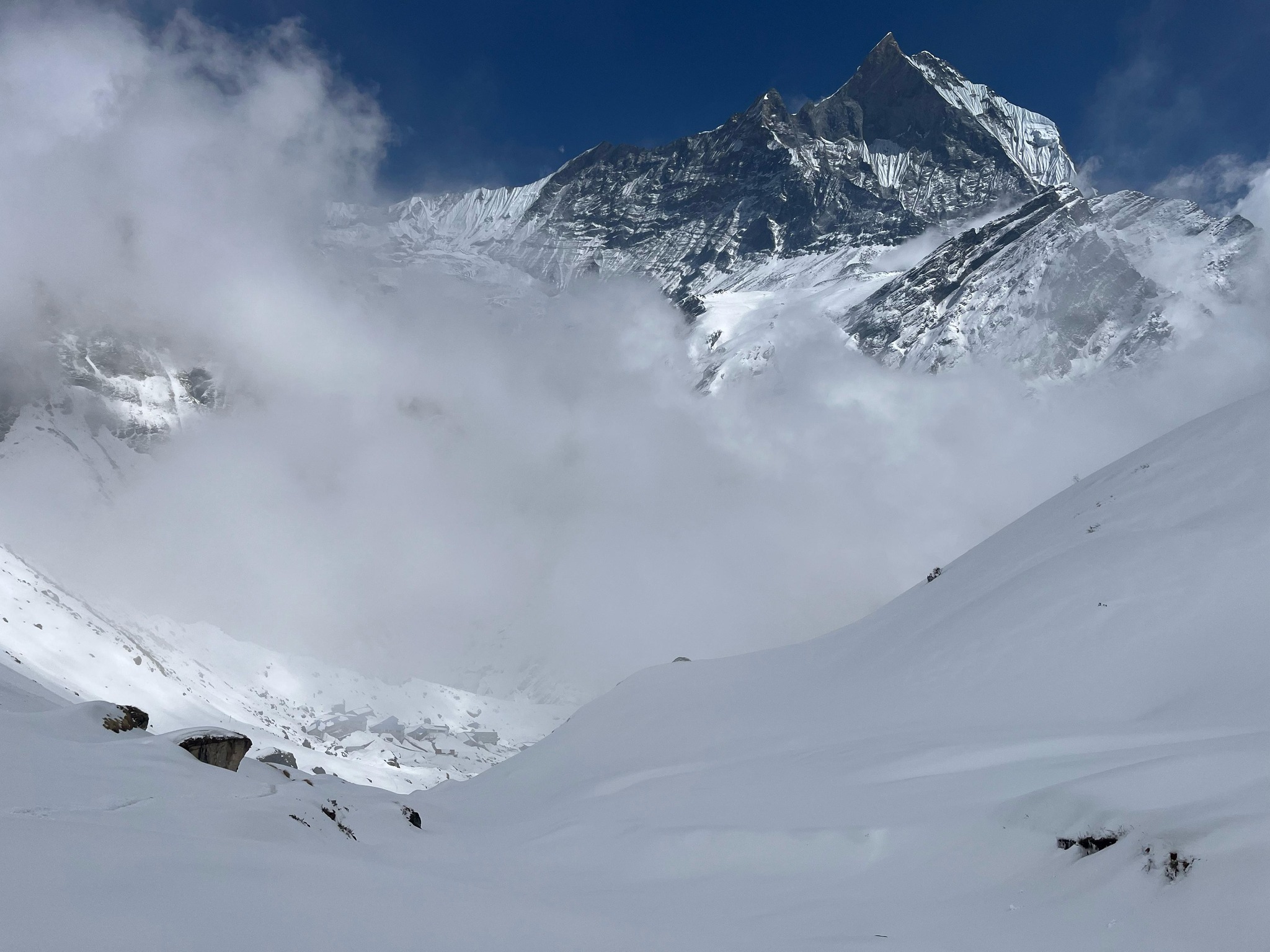 The Seven Summit Treks Annapurna I expedition will begin in mid-March from Kathmandu. You will have a couple of days to prepare your equipment and paperwork. Afterward, you will take a flight or vehicle to Pokhara and continue your trek or helicopter flight from Dana to base camp, depending on the itinerary. We will set up four camps and rotate frequently between them for optimal acclimatization. Base camp is typically located at 4190 m/13,747 ft, Camp I at 5150 m/16,896 ft, Camp II at 5700 m/18,700 ft, Camp III at 6500 m/21,325 ft, Camp IV at 7400 m/24,278 ft, and the summit at 8091 m/26,545 ft. Annapurna is one of the two most dangerous mountains in the world to climb (along with K2), with a terrifying summit fatality rate.